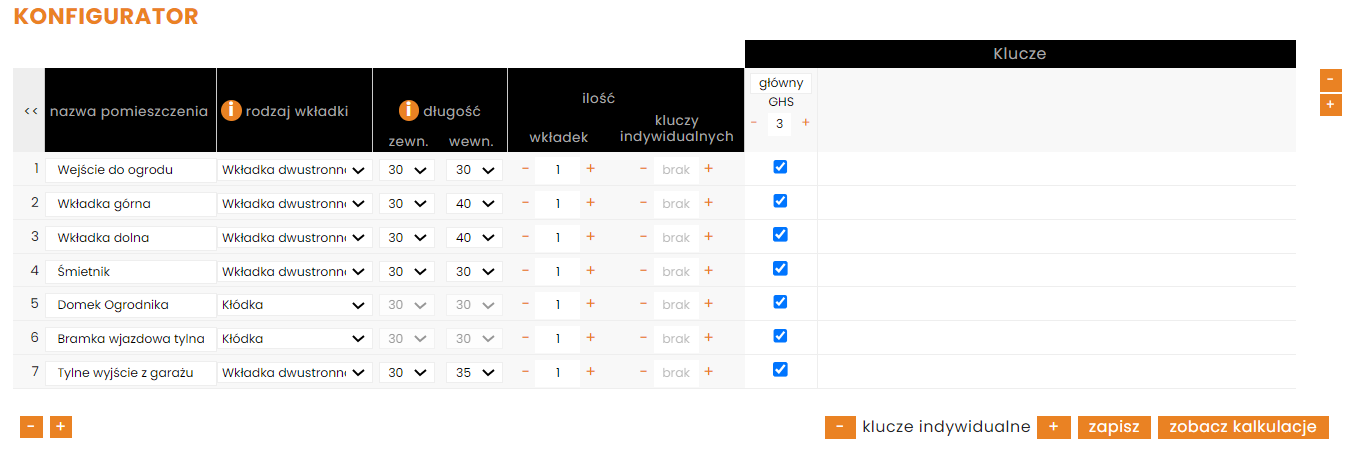 - jeżeli czujesz się na siłach i wiesz jak prawidłowo zwymiarować potrzebną wkładkę, to nic nie stoi na przeszkodzie, żebyś zrobił to samemu. W tym właśnie celu powstał nasz KONFIGURATOR, gdzie sam tworzysz plan klucza i system zamawiasz - jak w typowym sklepie internetowym. Oszczędzasz dzięki temu na usłudze pomiarów i montażu. Ale ryzyko podania prawidłowych długości wkładek jest po Twojej stronie ????